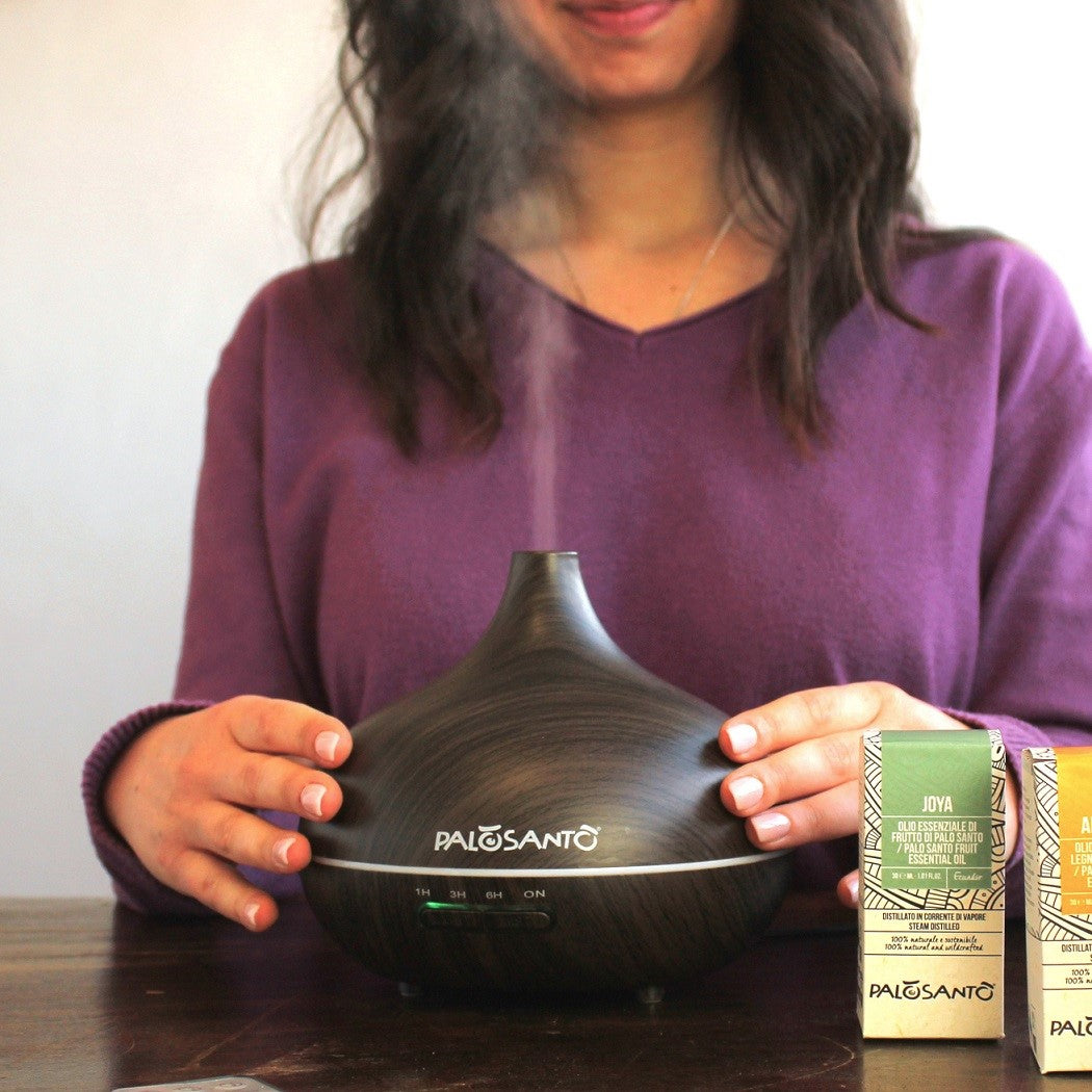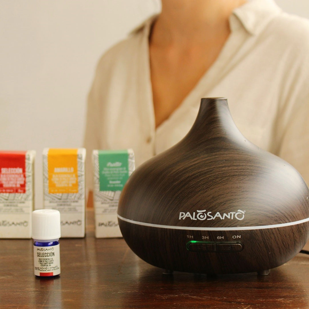 - Fill the diffuser with up to 500 ml of water and add a few drops (up to 15) of your favorite essential oil. Try our Palo Santo Essential Oils to harmonize your spaces and give relaxation and relief to your mind and spirit.
