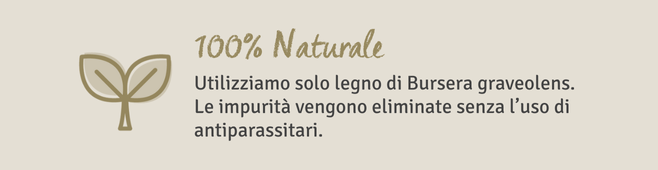 Bursera Graveolens is the plant from which Palo Santo incense is obtained. We only collect wood from plants that have fallen to the ground at the end of their life cycle. The wood is then left on the ground for 2 to 4 years before being harvested: this determines the sweet, intense and balsamic aroma typical of Palo Santo.