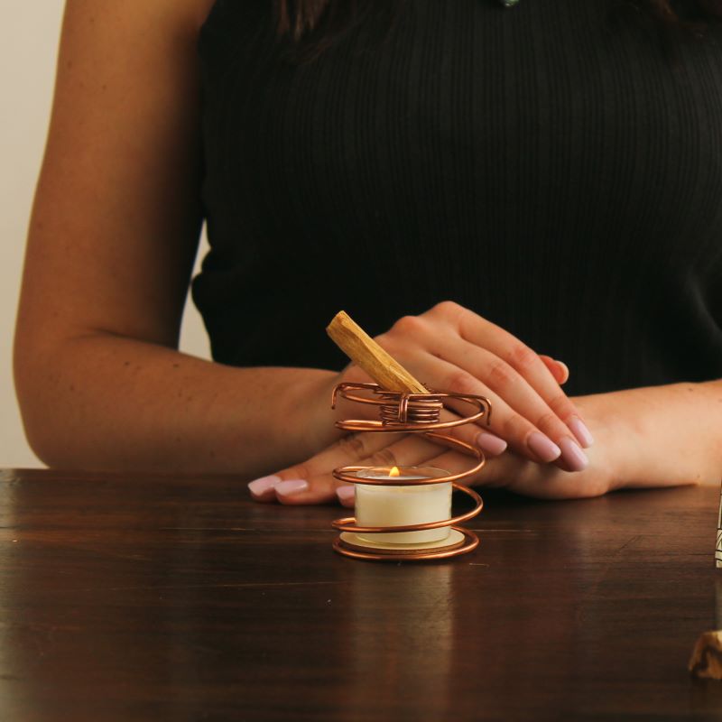 - Inserisci il legnetto di Palo Santo nell'apposito spazio del supporto in rame e attendi un paio di minuti. Assicurati che il legnetto sia quanto più possibile dritto e allineato sopra la fiamma della candela.